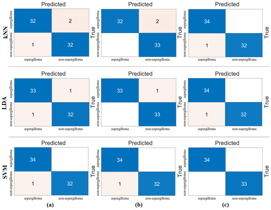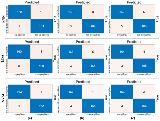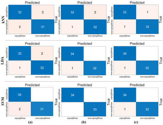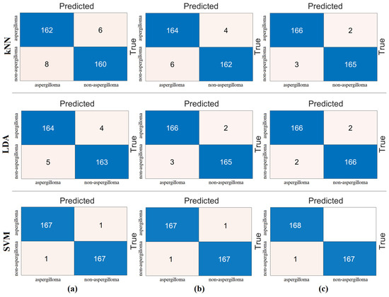 Confusion matrices obtained by processing the combined feature set (2560 features) with machine-learning methods: (a) kNN, (b) LDA, and (c) SVM.