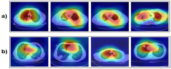 Sample image set obtained by applying the Grad-CAM technique to the dataset: (a) aspergilloma and (b) non-aspergilloma.