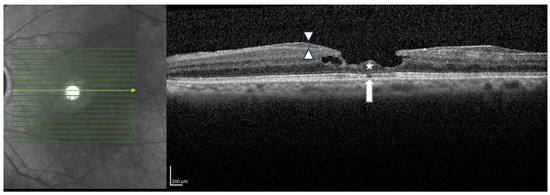 Lamellar Macular Hole Spectral Domain Optical Coherence Tomography (SD-OCT) imaging. The OCT scan reveals a characteristic lamellar macular hole, featuring an irregular foveal contour, a foveal cavity with undermined edges, a foveal thinning and the presence of epiretinal proliferation (heads of arrows) and foveal bump (star). Additionally, disruption in the ellipsoid line and the external limiting membrane (arrow) can be observed.