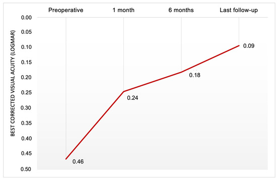 The follow-up period ranged from a minimum of 36 months to a maximum of 74 months, with an average of 54.9 ± 13.1 months. All 16 eyes showed an improvement in vision after surgery. The mean BCVA improved at each follow-up time point: it was 0.24 ± 0.16 LogMAR at 1 month, 0.18 ± 0.15 LogMAR at 6 months, and 0.09 ± 0.11 LogMAR at the last follow-up, with a range from 0.4 LogMAR to 0.0 LogMAR (Figure 2 and Figure 3). Significant improvement was observed between preoperative BCVA and BCVA at 1 month (p < 0.001). The improvement between BCVA at 1 month and BCVA at 6 months was not statistically significant (p = 0.072). There was a significant improvement between BCVA at 6 months and BCVA at the last follow-up (p < 0.001).
