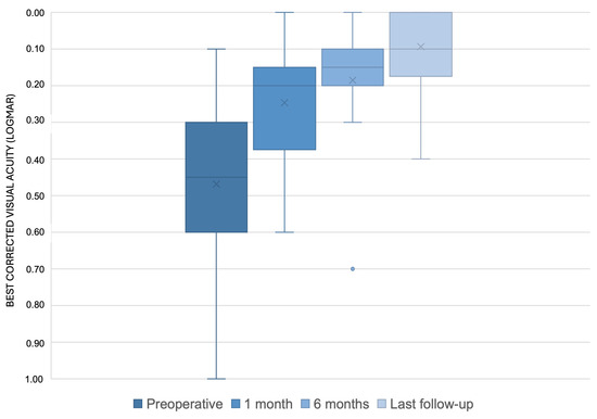 Box-plot of best-corrected visual acuity (BCVA) at the baseline and each follow-up time of the study. The BCVA improved by at least 0.3 LogMAR in 14 eyes (87.5%) when comparing the baseline to the last follow-up.