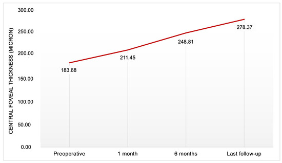 The mean CFT at the 1-month follow-up was 211.45 ± 43.55 microns, ranging from 124.35 to 298.55 microns. At 6 months follow-up, it was 248.81 ± 48.51 microns, ranging from 154 to 364 microns. At the last follow-up, CFT was 278.37 ± 45.50 microns, with a range of 225 to 377 microns. The increase in CFT was statistically significant (p < 0.001) at each follow-up time point: from baseline values to 1 month (increase of 27.7 microns), from 1 month to 6 months (increase of 37.36 microns), and from 6 months to the last follow-up (increase of 29.56 microns) (Figure 4 and Figure 5). Regarding CFT, 3 eyes (18.75%) exhibited an increase at 6 months, which remained stable at the last follow-up. In one eye, CFT decreased at 6 months but showed improvement at the last follow-up. In all other patients, there was an increase in CFT from 6 months to the last follow-up.