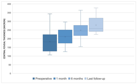Preoperative and postoperative (at 1 month, at 6 months, at last follow-up) CFT (central foveal thickness) for patient affected by lamellar macular hole who underwent pars-plana vitrectomy. The increase in CFT was statistically significant (p < 0.001) at each follow-up time point.