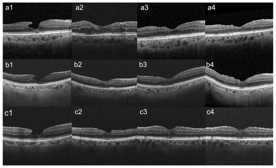 Preoperative and postoperative Optical Coherence Tomography appearance of lamellar macular hole in three patients. (a1–c1): Preoperative appearance. (a2–c2): Postoperative appearance at the 1-month follow-up. (a3–c3): Postoperative appearance at 6 months follow-up. (a4–c4): Postoperative appearance at the last follow-up (minimum 36-month after pars-plana vitrectomy).