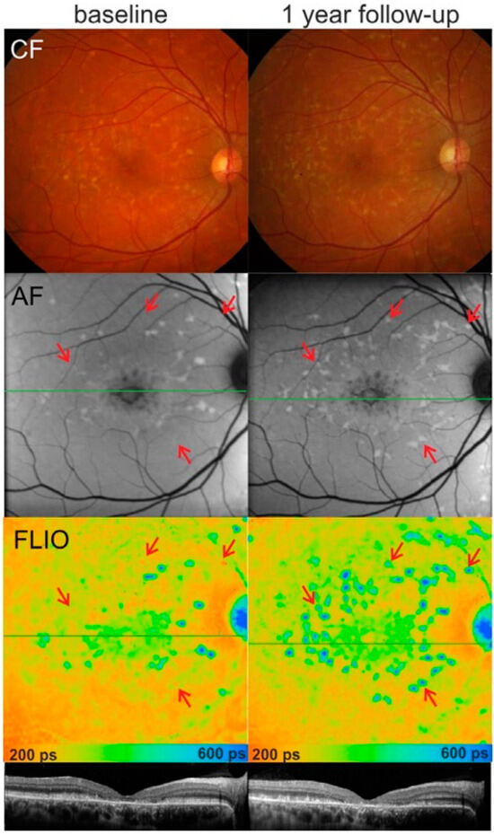 Stargardt disease (Figure 1) with the presence of flecks and macular atrophy is the most common macular dystrophy phenotype due to pathogenic variants in the ABCA4 gene. This results in abnormal accumulation of the A2E by-product, toxic to the RPE. On the evaluation of the flecks by FLIO vs. FAF intensity images, it was noted that changes in FLIO appear earlier than visible changes in FAF. The short fluorescence lifetime (242–322 ps) of early flecks was better identified in LSC. Patient’s symptoms were correlated with the onset of flecks with longer fluorescence lifetimes when the accumulation of bis retinoid was less. Flecks with short fluorescence lifetimes have more accumulation of the bis-retinoid by-products without the degeneration of outer retinal structures [29,30]. On the other hand, during the subsequent stage with long fluorescence lifetimes, there is more accumulation of lipofuscin, and degeneration of outer retinal structures sets in with the patient becoming symptomatic. It appears that flecks have longer lifetimes in the center of a fleck than the edges of the fleck [31].