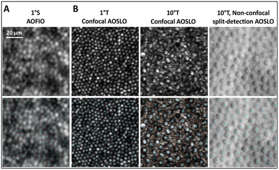 (A) AOFIO image of the normal cone mosaic at 1° superior to fixation. (B) AOSLO images of the photoreceptor mosaic in the parafovea using confocal imaging at 1° and 10° temporal to fixation using confocal and non-confocal split-detection. Individual cone and rod photoreceptors can be identified in the images (blue dots: cones, orange dots: rods). Reprinted with permission from [57] © Optica Publishing Group (Morgan, J.I., T.Y. Chui, and K. Grieve, Twenty-five years of clinical applications using adaptive optics ophthalmoscopy. Biomedical Optics Express, 2022, 14, 387–428.).