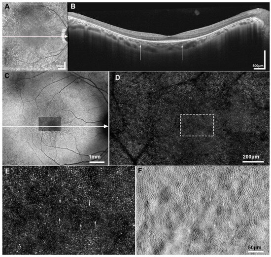 Multimodal imaging of retinitis pigmentosa: (A) Infrared reflectance (IR) fundus photograph of a subject with X-linked retinitis pigmentosa associated with RPGR gene. The white arrow represents the section of the optical coherence tomography (OCT) presented in (B). (B) Horizontal transfoveal OCT line scan, with the white arrows indicating the width of the corresponding AOSLO imaged area in (D). (C) Fundus autofluorescence imaging, with the confocal AOSLO (cAOSLO) imaged area (D) superimposed over the foveal avascular zone, and the white arrow represents the section presented in the OCT scan (B). (D) cAOSLO imaging reveals a disrupted waveguiding mosaic, not as uniform in appearance as in a healthy subject. (E) Magnification of cAOSLO over the estimated foveal center (marked with a white dashed square in (D)) shows irregularly waveguiding cones, which appear dim (some are indicated with white arrows); and (F) the corresponding split detection AOSLO in exact spatial registration showing relatively healthy-appearing cone inner segments; the white arrows indicate the corresponding inner segments for the irregularly waveguiding cones identified with white arrows in (E). {Reprinted under Creative Commons CC BY 4.0 license [42] (Georgiou, M., et al., Adaptive optics imaging of inherited retinal diseases. British Journal of Ophthalmology, 2018, 102, 1028–1035.)}.