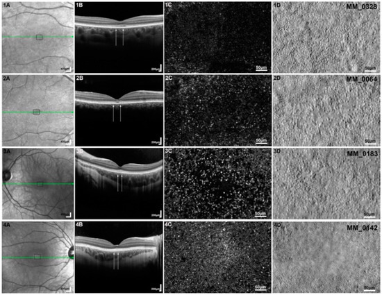 Adaptive optics scanning laser ophthalmoscopy (AOSLO) imaging of the cone dysfunction syndromes: Column (A) shows the infrared reflectance (IR) fundus photographs for each subject (1–4). The green arrow represents the section in which the optical coherence tomography (OCT) (Spectralis HRA + OCT, Heidelberg Engineering, Heidelberg, Germany) presented in column (B) is taken; the black square represents the 450 μm × 300 μm region of interest imaged with AOSLO, which is presented in columns (C,D). Column (B) shows OCT horizontal scans through the fovea and the white arrows mark the corresponding AOSLO area (450 μm wide). Column (C) depicts confocal AOSLO (cAOSLO) and column (D) split detection (SD) AOSLO. Subjects (1) and (2) have achromatopsia associated with CNGB3 and CNGA3 gene mutations, respectively. (1C,2C) Dark spaces are observed, due to the loss of cone waveguiding properties, which correspond to visible foveal cone inner segments in (1D,2D), respectively, with a substantial difference in cone numerosity between the two subjects. (3) A molecularly confirmed subject with blue cone monochromacy. (3C) Dark foveal center, with a sparse array of large bright spots, which are believed to be S cones, immediately surrounding it. (3D) Remnant inner segment structure. (4) A molecularly confirmed subject with Bornholm eye disease (LIAVA haplotype). (4C) All cones are resolved in cAOSLO, with a few apparent non-waveguiding cones (dark spaces). (4D) SD-AOSLO does not resolve foveal inner segments due to the better-preserved mosaic (smaller cone diameters and tighter packing geometry) compared with the other cone dysfunction syndromes. {Reprinted under Creative Commons CC BY 4.0 license [42] (Georgiou, M., et al., Adaptive optics imaging of inherited retinal diseases. British Journal of Ophthalmology, 2018, 102, 1028–1035.)}.