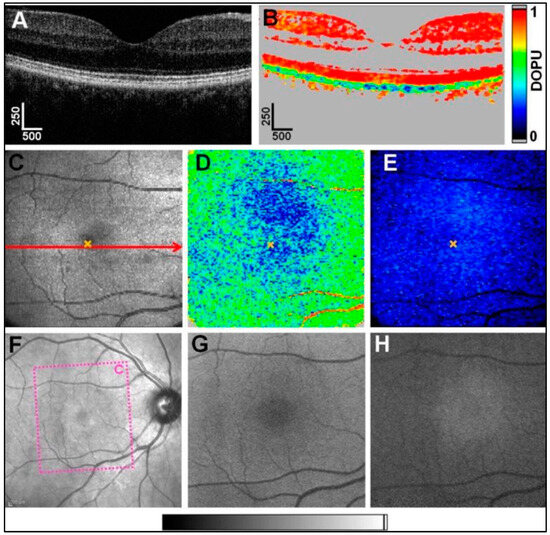 PS-OCT in healthy eyes: There are two ways of melanin quantification: (1) Degree of polarization uniformity (DOPU—Figure 5). Polarimetric entropy to assess the amount of depolarization. DOPU is sensitive to the incident state of polarization and does not have a noise-bias correction. DOPU values are close to 1 in most retinal layers under a healthy condition. Lower DOPU values indicate depolarization (seen in RPE and choroid). Polarimetric entropy is linearly proportional to melanin concentration. Entropy values for RPE are higher in the center of the macula and lower outside. The entropy of RPE melanin is noted to increase with age (increased melanolipofuscin granules) and is negatively correlated with axial length. On the other hand, the entropy of choroidal melanin is non-uniform [133]. In terms of retinal imaging, PS-OCT is particularly helpful in detecting structural alterations in the RPE (which can have similar reflectivity to other adjacent structures like the photoceptor layer) and differentiating them from scar tissues.