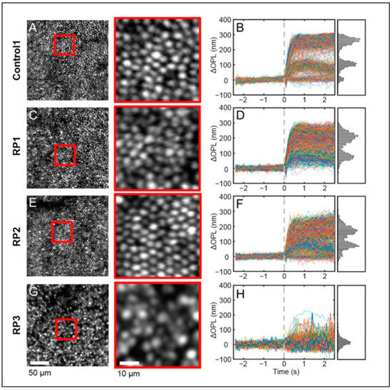 Cone photoreceptor structure and function. AO-OCT en face images of the cone mosaic at 2° eccentricity in one of the controls (A,B) and the three RP subjects: RP1 (C,D), RP2 (E,F), and RP3 (G,H). Magnified views are shown for cones in red boxes. Cone densities are 31,491 (Control1), 22,750 (RP1), 25,258 (RP2), and 14,041 (RP3) cones/mm2. Traces of individual cones’ ΔOPL responses to 637 nm stimulus are shown in (B,D,F,H). Traces are randomly color-coded, and histograms of peak responses (average ΔOPL from 0.75 to 1.25 s after stimulus) are shown to the right of each plot. {Reprinted under Creative Commons CC BY 4.0 license [54] (Lassoued, A., et al., Cone photoreceptor dysfunction in retinitis pigmentosa revealed by optoretinography. Proceedings of the National Academy of Sciences, 2021, 118, e2107444118.)}.