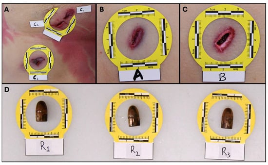 Traditional forensic pathology texts describe predictable entry wounds as small, circular defects with abrasion collars and exit wounds as larger and more irregular due to the bullet’s deformation and pressure release. Tissue damage typically includes laceration, crushing along the bullet track, and cavitation effects from the projectile’s kinetic energy. In Case 3, the presence of soot and stippling around Wound A confirmed a close-range shot, consistent with traditional descriptions. In Case 1, the bullet wounds displayed significant deviations from these models. The cranio-caudal arrangement of wounds C1, C2, and C3 indicated instability of the bullets, leading to irregular impacts. This aligns with Haag et al., who noted that bullets that ricochet or are destabilized by impact with an object can produce atypical entry wounds due to their yawing or tumbling motion in flight [].