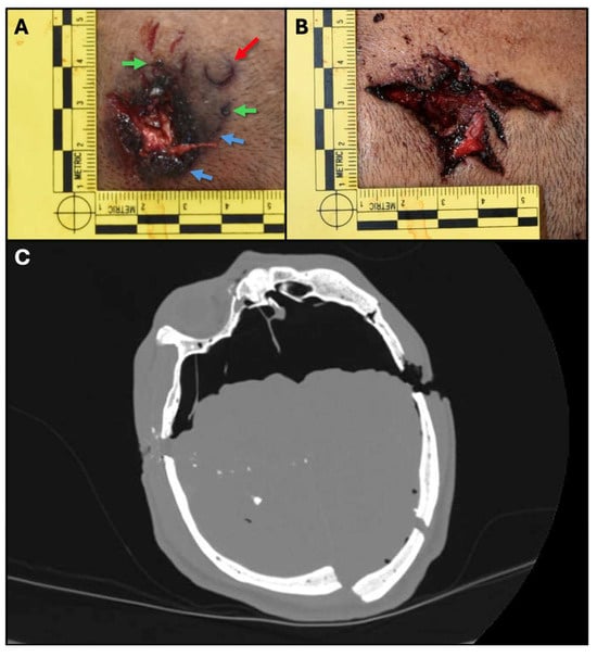 Cranial Gunshot Wounds and CT Scan of Case 2. (A) Entrance wound caused by Bullet A, located on the right temporal region of the head. The wound is irregularly oval with stellate margins, featuring three small notches, and measures approximately 1.6 cm by 1.2 cm. The wound exposes brain tissue, with a visible protruding flap of dura mater and a surrounding dark brownish discoloration measuring 3.2 cm by 3.5 cm. Key forensic indicators are present, highlighted by colored arrows: Werkgartner’s sign is indicated by a red arrow, showing the imprint of the pistol’s recoil spring guide rod; a burn halo and soot deposition are marked by blue arrows; and unburned powder residues are identified with green arrows around the wound; (B) Exit wound caused by Bullet B on the left occipital region. This wound is characterized by hemorrhagic, thickened, and irregular stellate margins with six distinct arms, measuring approximately 5.3 cm by 3.5 cm, exposing underlying skull and brain tissue; (C) CT scan showing intracranial bone fragments in a “comet tail” pattern, characteristic of an entrance wound. The scan provided crucial information to differentiate between entrance and exit wounds, supporting the conclusion that Wound A was the entrance wound while Wound B was the exit wound.