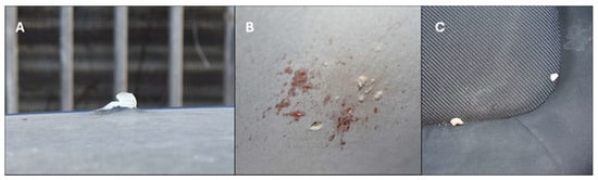(A) hole with outward-oriented edges in the car roof; (B) hole in the car roof with bloodstain area; (C) cranial bone fragments found on the car seat.