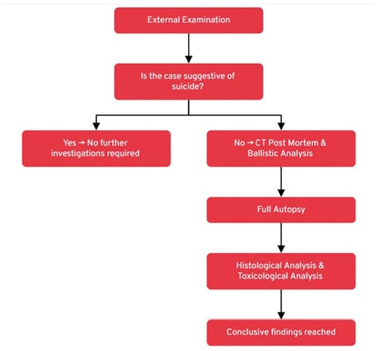 Initially, an external examination is conducted to assess whether the case is suggestive of suicide. If the findings support this hypothesis, further investigations may not be necessary. However, in cases where the dynamics are unclear or a homicidal scenario is suspected, a postmortem CT scan is performed in parallel with a ballistics analysis. These steps provide essential data on bullet trajectories and the dynamics of the shooting, which guide the subsequent full autopsy. The autopsy then provides a macroscopic evaluation of the injuries, while histological and toxicological analyses are conducted in parallel to further clarify the microscopic characteristics of the wounds and identify any substances that may have influenced the death. Through this methodical process, forensic investigators are able to gather all relevant data necessary to reconstruct the events surrounding the death and reach conclusive findings, thus ensuring that no further investigations are required.