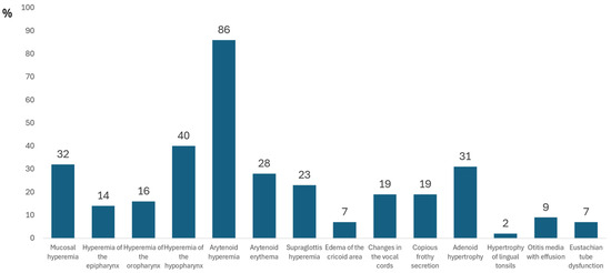 The most common condition is arytenoid hyperemia, which is reported in 86% of cases, followed by hyperemia of the hypopharynx in 40%, and adenoid hypertrophy in 31%. Mucosal hyperemia is seen in 32% of cases, while other conditions, such as arytenoid erythema and supraglottic hyperemia, are seen in 28% and 23% of cases, respectively. Less common findings include cricoid edema and Eustachian tube dysfunction (both 7%), while hypertrophy of the lingual tonsils is rare at 2%. The median number of ENT findings per symptom group was 3 (range, 0–8), and there was no difference in the number of ENT findings between symptom groups (p = 0.388).