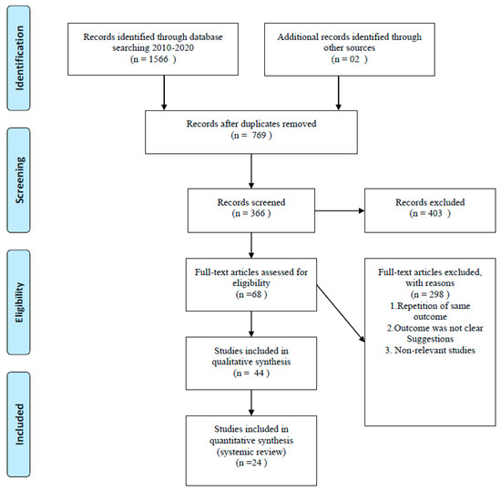 We conducted a literature search using Google, Google Scholar, PubMed, Wiley Library, Medline, Clinical trials.org, and Web of Science. Our search strategy included MeSH terms and keywords for giant cell tumor and biogenetic markers from January 2010 to September 2020. All three grades of the tumor, according to the Campanacci classification, were included in the study. All research articles in languages other than English were excluded. Phase I clinical trials, metanalyses, review articles, case reports, and case series were excluded from the study. After excluding review articles, duplicates, and non-relevant articles, we included 24 articles out of 1568 articles, summarizing the role of biogenetic markers in the prognosis of GCT as mentioned in Figure 1. We focused on the research question: Differentiation and identification of giant cell tumor from its malignant variant and other bony pathologies producing giant cells. As the primary endpoint of this review article is identification and differentiation of biogenetic markers, so these data will help to identify GCT, differentiation from other giant cell-containing pathologies, and prognosis of the disease.