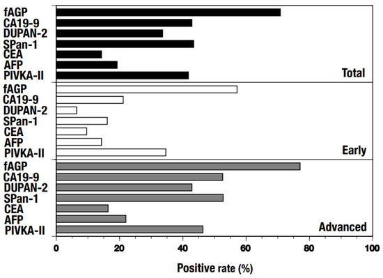 Positive rates of fAGP and respective tumor markers in plasma samples from patients with either hepatic, biliary tract, or pancreatic cancer. The total numbers of the patients examined were as follows: fAGP (178), CA19-9 (168), DUPAN-2 (122), SPan-1 (122), CEA (168), AFP (78), and PIVKA-II (67) (top). The positive rates were also determined depending on their clinical stages, such as in the early (stages 0–1) (middle) and advanced (stages 2–4) (bottom) stages, respectively.