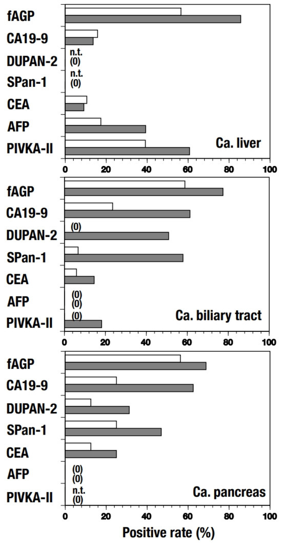 Positive rates of fAGP and respective tumor markers in plasma samples from patients with hepatic, biliary tract, and pancreatic cancer. White and gray bars (top, middle, and bottom) indicate corresponding positive rates in patients in the early (stages 0–1) and advanced (stages 2–4) stages, respectively. n.t. = not tested; (0) = no samples tested.