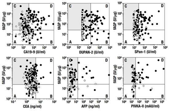 Diagnostic results of all patients were displayed as a set of levels of both respective tumor markers and fAGP, concurrently measured. Each symbol was plotted based on a set of levels of the tumor markers (horizontal axes) and fAGP (vertical axes). Four quadrants were defined by two axes lined at two cutoff values of the tumor markers (indicated) and fAGP (25.45 U/mg). Each quadrant includes patients who possess fAGP (−) and the tumor marker (−) (A), fAGP (−) and the tumor marker (+) (B), fAGP (+) and the tumor marker (−) (C, gray screen), and fAGP (+) and the tumor marker (+) (D), respectively. White and black circles indicate patients with early (stages 0–1) and advanced (stages 2–4) stages, respectively. Numbers of patients were as follows: in CA19-9/fAGP (168 with 52 early and 116 advanced stages), in DUPAN-2/fAGP (122 with 31 early and 91 advanced stages), in SPan-1/fAGP (122 with 31 early and 91 advanced stages), in CEA/fAGP (168 with 52 early and 116 advanced stages), in AFP/fAGP (78 with 28 early and 50 advanced stages), and in PIVKA-II/fAGP (67 with 26 early and 41 advanced stages).
