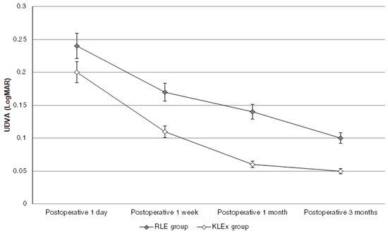 The postoperative visual acuity comparison between the RLE and KLEx groups illustrated a non-significant difference. In an earlier publication, good postoperative visual acuity was observed in individuals who received KLEx surgery [24]. In addition, the UDVA recovery is also faster in the patients receiving RLE surgery [25], and a postoperative UDVA of 20/20 can be achieved in 65% of patients receiving RLE surgery [26]. Nevertheless, there was no study that evaluated the efficiencies of RLE and KLEx surgeries in the same population. To our knowledge, this study may be the first to exhibit a comparison of postoperative UDVA recovery between the RLE surgery and the KLEx surgery. In addition, the myopia and astigmatism degrees of the two groups were similar; thus, the influence of refractive error extents on the whole-group analysis of this study may be minor. In addition, we adjusted for age and sex in the multivariable analysis that evaluated the trends in visual recovery from the two surgeries. Consequently, the compatible results of visual recovery of the RLE and KLEx surgeries may be credible. The second-generation KLEx surgery may have resulted in a relatively limited UDVA improvement one day postoperatively due to corneal edema resulting from the high-frequency laser emission and more laser spots [19], but the UDVA reached an acceptable level one week postoperatively in our patients. The UDVA of the RLE group also presented a smooth recovery, in which the mean UDVA one day postoperatively was 0.24. The relatively worse postoperative UDVA in the RLE group than in the second-generation KLEx surgery group may have resulted from the lower level of initial postoperative UDVA in the RLE group. The UDVA recovery resulting from the RLE surgery was not inferior to that from the second-generation KLEx surgery. The difference in percentages of patients reaching a final UDVA of 20/20 between groups was about 9 percent, which showed minimal statistical and clinical differences.