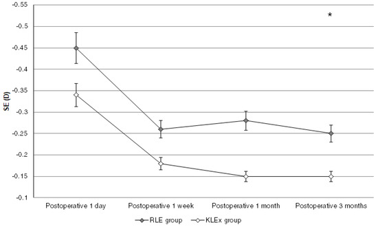 The changes in the postoperative spherical equivalent of the groups. * denotes a significant difference between groups.