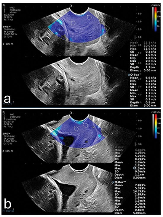(a) Shear wave elastography image from a 26-year-old woman at 35 weeks gestation, showing high stiffness (11.1 kPa) in the anterior internal os; this patient delivered naturally at 38 + 4 weeks. (b) Shear wave elastography image from a 31-year-old woman at 34 weeks gestation, showing reduced stiffness (4.8 kPa) in the anterior internal os; this patient experienced preterm birth at 35 + 2 weeks due to premature rupture of membranes. Image adapted from Smith et al. [] under a Creative Commons Attribution 4.0 International License. Changes were made to resize and adjust the images.