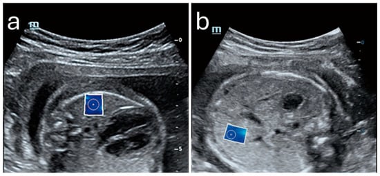 Sonoelastography offers a unique window into fetal development by providing quantitative insights into tissue properties and markers for identifying developmental progress and complications. By measuring the elastic properties of key organs such as the lungs, liver, and brain, clinicians could potentially evaluate organ maturity, detect potential anomalies, and make informed decisions regarding perinatal care [,,,,,,,,]. Figure 4 shows an example of a normal lung and liver in a fetus.