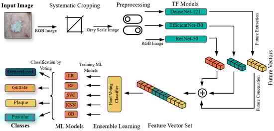 In this study, we combined TL’s strong feature extraction and generalization capabilities on limited datasets with EL’s ability to integrate the best aspects of various machine learning techniques. This approach introduces a hybrid method that leverages both TL and EL techniques, proposing a highly generalizable model for the diagnosis of psoriasis subtypes. For this purpose, we utilized a unique dataset consisting of images of psoriasis patients treated at the Dermatology Clinic of Firat University Hospital. The dataset, labeled by expert dermatologists, comprises 930 images representing four psoriasis subtypes: generalized, guttate, plaque, and pustular psoriasis.