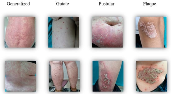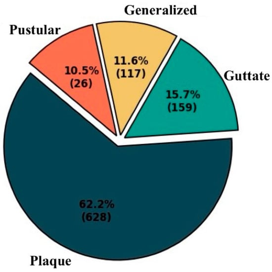 The study’s dataset consists of 930 psoriasis images, including 117 generalized, 159 guttate, 628 plaque, and 26 pustular cases. The primary reason for this imbalance is that pustular psoriasis is one of the rarest types globally [].