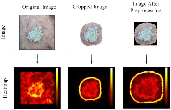 The impact of data preprocessing steps on the image: heat maps of original, cropped, and fully preprocessed images.
