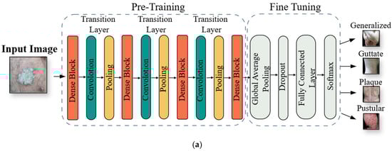 Transfer learning (TL) techniques represent a type of deep learning (DL) that enables the application of model weights and features obtained from training on millions of images for various tasks to a new task. This approach provides a practical solution in scenarios where access to sufficient labeled data is limited or unavailable, enabling high accuracy and rapid predictions. In skin diseases like psoriasis, where rare subtypes often have restricted data availability, the application of TL effectively eliminates this disadvantage. Each TL model offers a unique architecture, capturing distinct features from images to enhance the classification performance [].