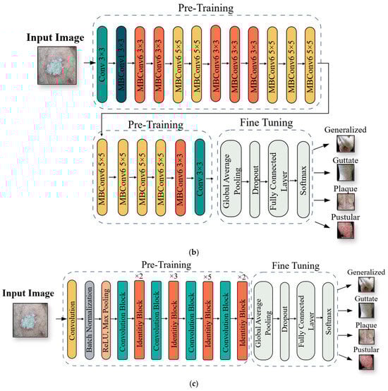 The architecture of TL models: (a) DenseNet-121, (b) EfficientNet-B0, (c) ResNet-50.