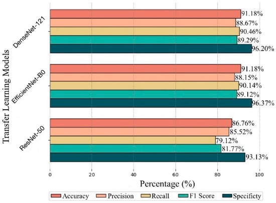 The performance of the DenseNet-121, EfficientNet-B0, and ResNet-50 TL models was evaluated using the metrics accuracy, precision, recall, F1 score, and specificity. The highest accuracy (91.18%) was achieved by both DenseNet-121 and EfficientNet-B0, with these two models exhibiting similar performance across all other metrics. The DenseNet-121 model demonstrated balanced success with 88.67% precision, 90.46% recall, 89.29% F1 score, and 96.20% specificity. The EfficientNet-B0 model slightly outperformed DenseNet-121 in specificity with a value of 96.37%. In contrast, the ResNet-50 model showed the lowest performance, with 86.76% accuracy, 85.52% precision, 79.12% recall, 81.77% F1 score, and 93.13% specificity. The performance metrics of the three TL models are presented in Figure 6.