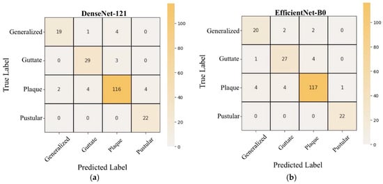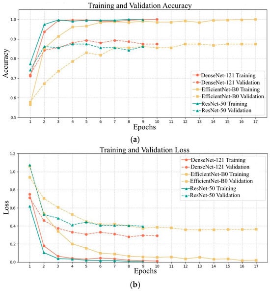 The training and validation loss and accuracy graphs for the models are presented in Figure 7. The ResNet-50 model demonstrated the shortest training time due to the effect of the early stopping callback function. Conversely, the DenseNet-121 model had the longest training time and exhibited the most consistent performance in terms of both validation and loss metrics compared to the other two models. While EfficientNet-B0 achieved accuracy levels similar to DenseNet-121, its performance was less stable due to fluctuations in validation loss. Although ResNet-50 had the shortest training time, the gap between its training and validation metrics was more pronounced compared to the other models, indicating a higher tendency towards overfitting.