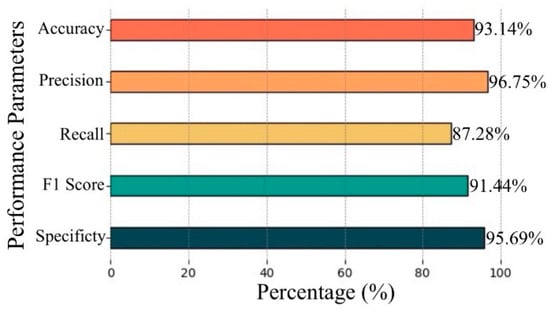 In this study, the HVC model demonstrated the highest performance across a broad range of metrics. Figure 8 illustrates the model’s performance metrics. The model achieved 93.14% accuracy, 96.75% precision, 87.28% recall, 91.44% F1 score, and 95.69% specificity. These results indicate that the HVC model provides a balanced performance between accuracy and specificity, while also delivering strong precision and recall.