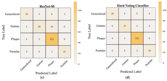 DenseNet-121 and EfficientNet-B0 exhibited balanced performance across all metrics; whereas, ResNet-50 struggled, particularly in detecting positive samples. In contrast, the HVC model achieved the highest precision, recall, and F1 scores, outperforming individual models. These results demonstrate the effectiveness of integrating diverse learning models in addressing complex and imbalanced datasets, such as those involving psoriasis subtypes.