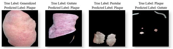 The confusion matrices for the test data of the TL and HVC models used in the study are presented in Figure 9. Additionally, Figure 10 displays examples of images that were misclassified by the HVC model. The dataset images typically display only a limited lesion area. Although lesions in subtypes like generalized are spread across larger body areas, the images showing restricted regions were misclassified by the model as the plaque subtype. This is likely due to the fact that plaque lesions are generally confined to smaller areas. Additionally, some images suffered from quality issues, such as loss of clarity in lesions and insufficient image resolution, which also contributed to misclassifications.