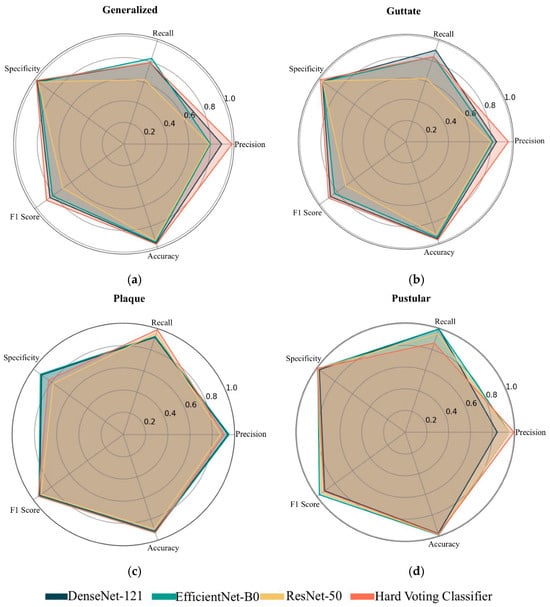 The proposed HVC model achieved superior performance compared to individual TL models, with metrics including 93.14% accuracy, 96.75% precision, 87.28% recall, 91.44 F1 score, and 95.69% specificity. The performance metrics for each class in the dataset are also shown through the radar chart in Figure 11. Upon examining Figure 11, it is observed that the highest performance across all classes was achieved by the HVC model. While DenseNet-121 and EfficientNet-B0 delivered balanced results, they fell short of the performance exhibited by HVC. The Res-Net-50 model, on the other hand, struggled particularly in detecting positive examples. The most successful class for the models was the pustular class, with the HVC model achieving 100% recall, 100% specificity, and 92.68 F1 score. The guttate and plaque classes exhibited balanced performance across all models. The lowest performance was observed in the generalized class.