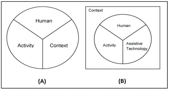 Cook and Hussy, who proposed the original HAAT model [27], are engaged in rehabilitation engineering and occupational therapy, respectively. Both disciplines often involve assistive technology service delivery based on a conceptual model incorporating three common elements: human/person, activity/occupation, and context/environment, as proposed by Baily [28].