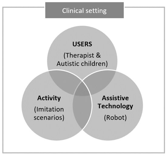 Within the framework, we aim to illustrate variables affecting the use of robotics for children with ASD in a clinical setting, and hence improve their imitation skills. The intersection of the following four variables represents the match between user, activity, and assistive technology.