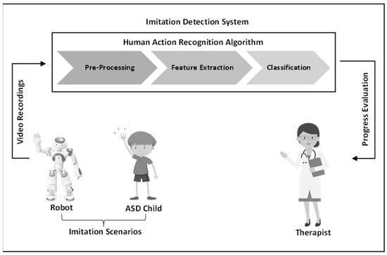 Children with ASD cannot easily recognize body language, make eye contact, explain personal feelings, or understand other people’s emotions. They also present obvious difficulties in imitation skills, having a lower frequency of imitation skills than that of typically developing children. Imitation includes body movement, whispering, and facial expressions through which children communicate with or oppose their parents [2]. Improving imitation skills during the early stages of development is essential for improving communication [3]. Faced with these limitations, health and educational professionals frequently struggle to motivate and engage children with ASD in treatment and learning activities. Participation in diverse social, playing, educational, and therapeutic activities is essential for acquiring the knowledge necessary for cognitive and social development [2].