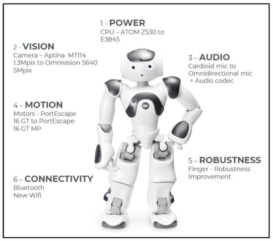 - Robaczewski, A.; Bouchard, J.; Bouchard, K.; Gaboury, S. Socially Assistive Robots: The Specific Case of the NAO. Int. J. Soc. Robot. 2021, 13, 795–831. [Google Scholar] [CrossRef]