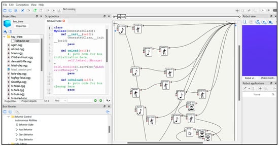 The robot was programmed using a multiplatform desktop application called Choregraphe, which allows for the creation of complex behaviors (e.g., robot–human interactions and dancing) through drag-and-drop features and Python scripting [34]. To create an action, we selected boxes from the Box Libraries panel, which contained all of the necessary elementary boxes for initial behaviors such as movement, speech, and sensing. The boxes were then connected to define the desired sequence of actions. For instance, an action might begin with a “Play Sound” box to make the robot talk or to upload an .OGG audio file, followed by a sequence of movement boxes to define clapping motions and an ending pose.