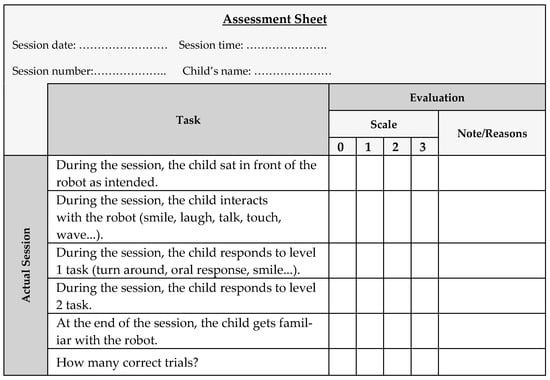 By adopting the VB-MAPP assessment tool, we evaluated whether each child had imitated the robot’s actions, acquired the skill, and applied it to various contexts (i.e., generalized the skill). The VB-MAPP assessment tool, which is designed to evaluate and track the development of language and social skills of children with autism, serves as a curriculum guide, criterion-referenced assessment tool, and skill-tracking system [39]. Imitation skills were considered to be mastered if the child achieved 80% to 100% correct trials across three independent sessions, as done in a previous study [40].