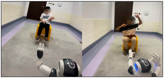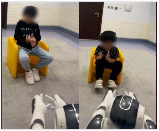 As shown in Figure 8, the NAO robot was placed directly in front of the child, who was seated either on a chair or on the ground. The child-to-robot distance was carefully selected to protect the child from injury if the robot fell.