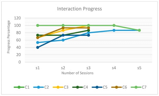 As shown in Figure 10, the children progressively interacted with and accepted the robot as the sessions proceeded. However, as mentioned previously, the psychological and physical well-being of the children were also important. For instance, the interaction of C7 increased during each session, but decreased during the final session, when progress was impeded by illness.