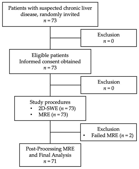 Study flow diagram. Out of 73 eligible patients enrolled, 71 completed both 2D-SWE and MRE imaging. Two patients were excluded due to MRE technical failures, leaving 71 for final analysis.