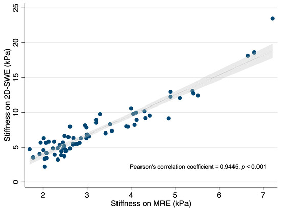 A strong positive correlation was observed between the liver stiffness measurements obtained by 2D-SWE and MRE. In Figure 3, the scatter plot demonstrates a close alignment of the stiffness values between the two modalities across the spectrum of stiffness levels. The Pearson correlation coefficient was 0.9445 (p < 0.001), indicating a very high degree of agreement.