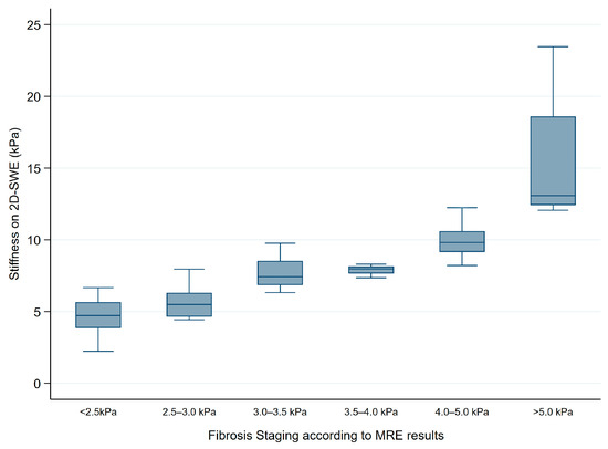 Distribution of 2D-SWE stiffness values across fibrosis stages categorized by MRE cut-off values. MRE thresholds used for fibrosis staging include <2.5 kPa for Normal, 2.5–3.0 kPa for Normal or Inflammation, 3.0–3.5 kPa for Stage 1–2 fibrosis, 3.5–4.0 kPa for Stage 2–3 fibrosis, 4.0–5.0 kPa for Stage 3–4 fibrosis, and >5.0 kPa for Stage 4 fibrosis or cirrhosis. The figure illustrates a progressive increase in median 2D-SWE values corresponding to advancing fibrosis stages.