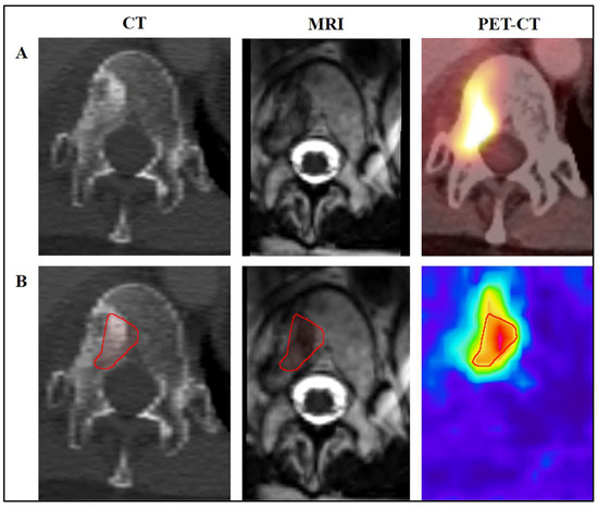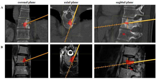 A 54-year-old patient with a recurrence of chondrosarcoma at the level of the thoracic spine (Th 12). The area corresponding to the FDG-avid lesion in the thoracic spine (Th 12) was marked with Smartbrush software for navigated biopsy, as visualized in (A) CT and (B) MR imaging.